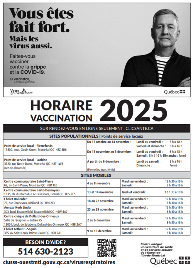 La campagne de vaccination du CIUSSS de l’Ouest-de-l’Île-de-Montréal débutera le 15 octobre 2025. Le vaccin contre la grippe est offert gratuitement à toute la population âgée de 6 mois et plus, tandis que le vaccin contre la COVID-19 est offert sans frais à certaines clientèles ciblées.