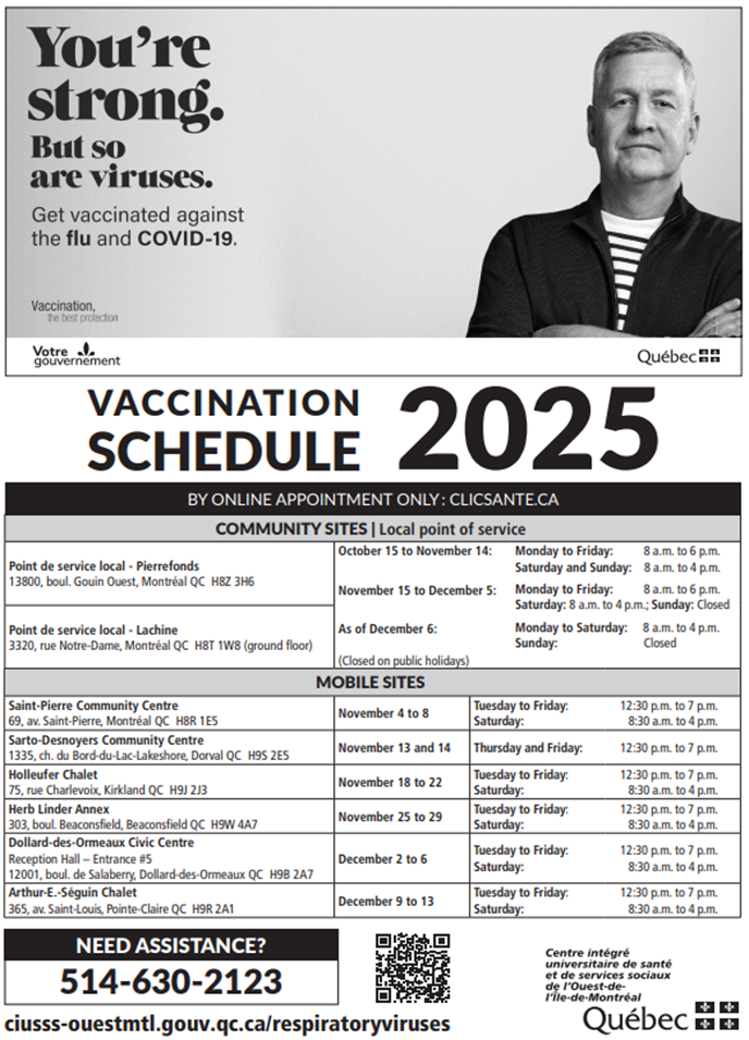 The CIUSSS West Island of Montreal vaccination campaign will begin on October 15, 2025. The flu vaccine is available free of charge to everyone aged 6 months and older, while the COVID-19 vaccine is offered free of charge to certain eligible groups.