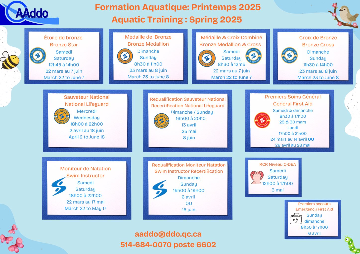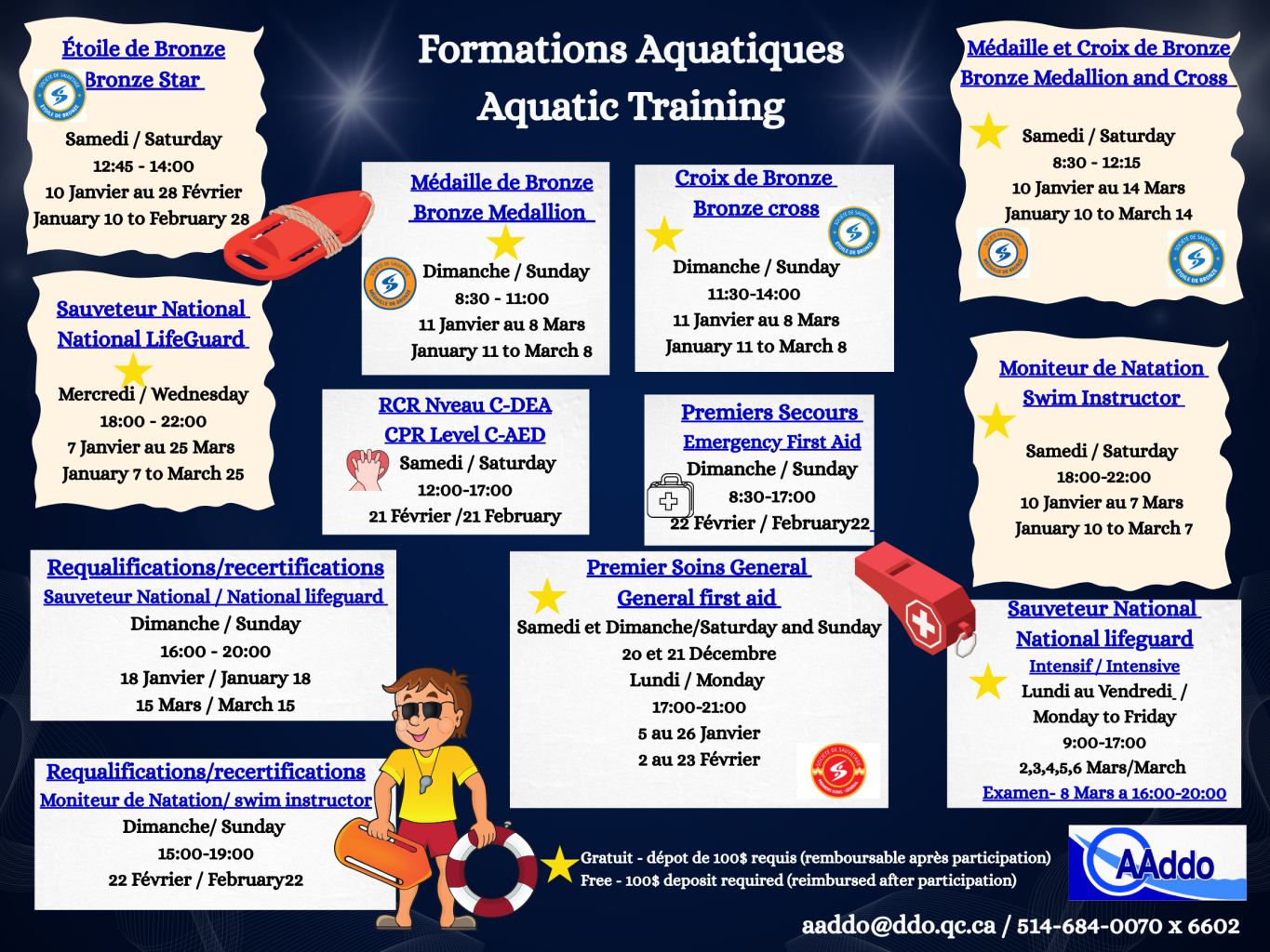 The National Lifeguard certification is available in four options: pool, waterfront, surf and water park. All include core content in addition to specialized training for the specific lifeguarding environment. For more information on the other options, please visit https://sauvetage.qc.ca/