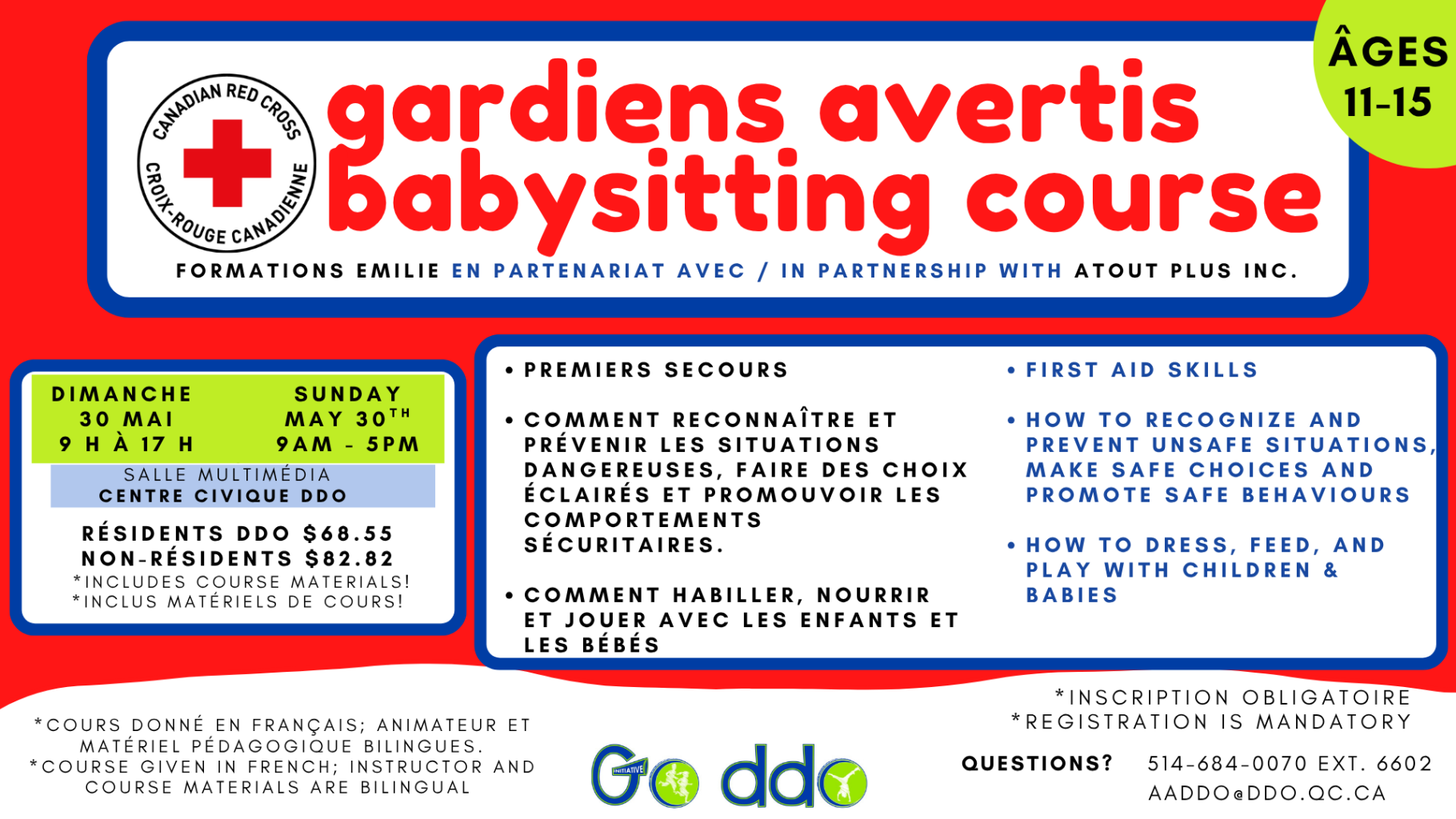 Ce cours complet est conçu pour les jeunes de 11 à 15 ans qui souhaitent devenir des gardiens ou gardiennes d’enfants responsables et en confiance. Développé par la Croix-Rouge canadienne, le programme couvre cinq domaines clés : les soins aux enfants, les premiers soins, la prévention des blessures, le leadership et les notions de base en affaires.