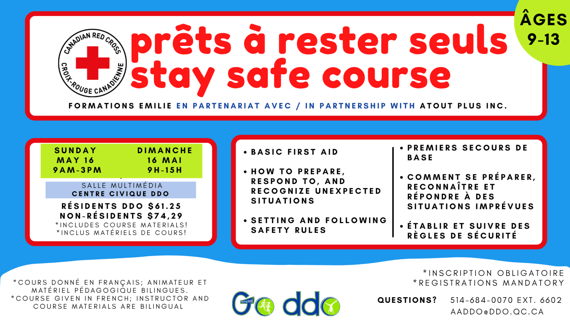 Le programme Prêts à rester seuls ! outille les jeunes de 9 à 14 ans avec la confiance et les compétences nécessaires pour faire face à des situations réelles en toute sécurité et avec assurance. Grâce à des leçons adaptées à leur âge et à des scénarios réalistes, les participants apprennent à prendre des décisions éclairées lorsqu’ils sont confrontés à des défis, que ce soit à la maison, dans leur communauté ou lorsqu’ils sont seuls.