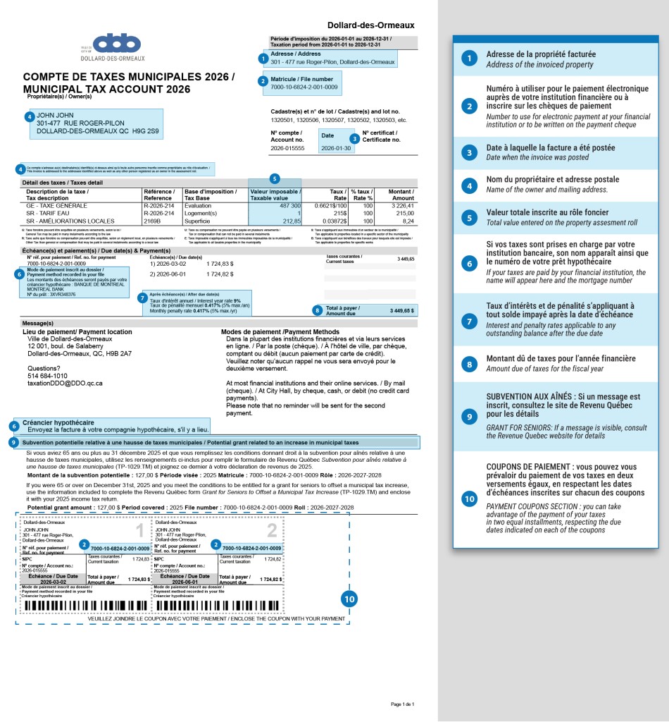 Vous devriez recevoir votre compte de taxes foncières début février, et il est payable en deux versements, soit le 2 mars et le 1er juin 2026. Aucun rappel ne sera envoyé pour le deuxième versement.