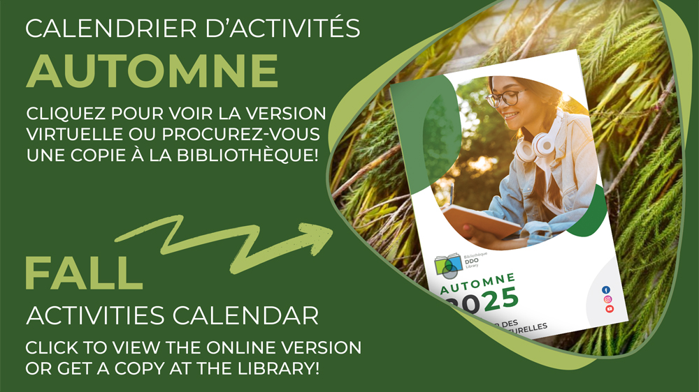 Vous pouvez consulter le calendrier des activités culturelles en ligne ou vous procurer une copie à la bibliothèque.