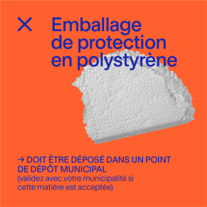 Le polystyrène rigide ou expansé, souvent appelé styromousse, utilisé comme matériau de protection dans les emballages de meubles, d’appareils électroniques ou autres produits, n’est pas accepté dans le bac bleu. Contrairement au polystyrène alimentaire, ce matériau se fragmente facilement en petites billes qui peuvent contaminer les autres matières recyclables.